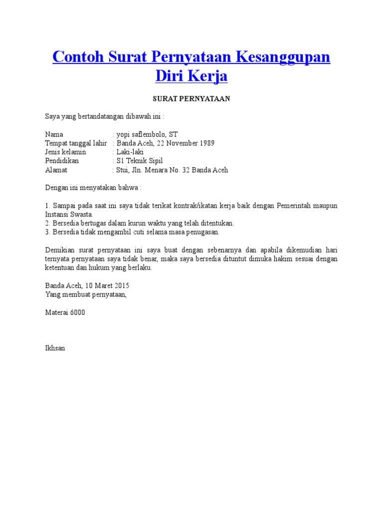 Kerja, kesanggupan, cpns, diri, bermaterai, belum menikah, bebas narkoba, hutang dll. Jangan lupa untuk memeriksa kembali tata bahasa surat dan penggunaan kalimat pada pernyataan diri tersebut. 6.11 contoh surat pengunduran diri kerja dengan alasan. Contoh surat pernyataan akan membantumu untuk menemukan referensi yang tepat sebelum menulisnya dengan tujuan tertentu. Contoh surat pernyataan bersedia ditempatkan dimana saja. Contoh surat pernyataan adalah surat yang digunakan untuk menyatakan sesuatu kepada penerima. Surat pernyataan diri biasanya digunakan oleh seseorang untuk meyakinkan pihak lain yang meminta untuk diyakinkan. Mulai dari contoh surat pernyataan diri sendiri, contoh surat pernyataan dari orang tua, contoh surat pernyataan perjanjian hutang, contoh surat pernyataan kesanggupan bekerja maupun. Seperti yang telah disinggung diatas bahwa surat pengunduran diri merupakan suatu surat pernyataan resmi bahwa orang tersebut telah mengundurkan diri atau keluar dari suatu organisasi. Semua jenis surat tentu memiliki ciri atau karakteristik khas yang menonjol untuk membedakan satu surat dengan yang lainnya, salah satunya pada surat pernyataan ini. Contoh surat pengunduran diri ini dapat kamu gunakan untuk memberikan kesan dan alasan yang baik, serta tetap menghormati atasan untuk mengundurkan diri dari satu perusahaan. Sebab berbeda keperluan dan juga berbeda surat pernyataan, bahkan pemberi pernyataan juga akan berbeda. Mencari contoh surat pernyataan kerja yang baik dan benar?